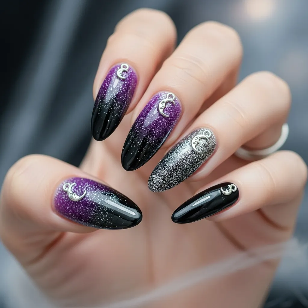 Witchy ombre nails bring together mystery and glam. The gradient effect from deep purple to black creates a magical night-sky look, while glitter accents add sparkle and allure. Adding small silver moon or star charms enhances the mystical feel, making this style a perfect match for a Long Pixie Bob, which already carries a modern witchy aesthetic.