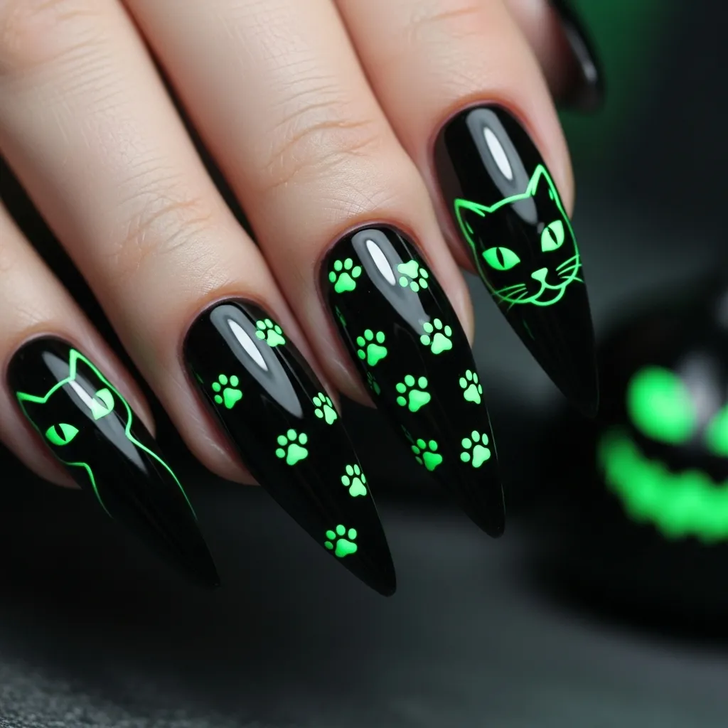 Black cat nails are a Halloween staple, symbolizing both mystery and elegance. The glossy black polish makes the perfect backdrop for cat silhouettes, while tiny glowing yellow eyes add a captivating pop. This design can be playful or mysterious, depending on your preference. Pair these nails with your Long Pixie Bob and a sleek outfit for a modern witch-inspired look that’s stylish yet spooky.