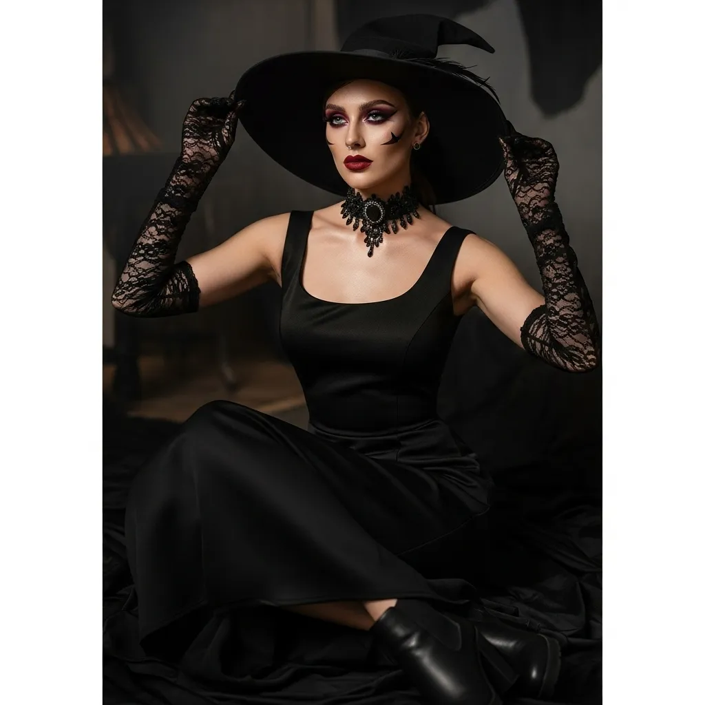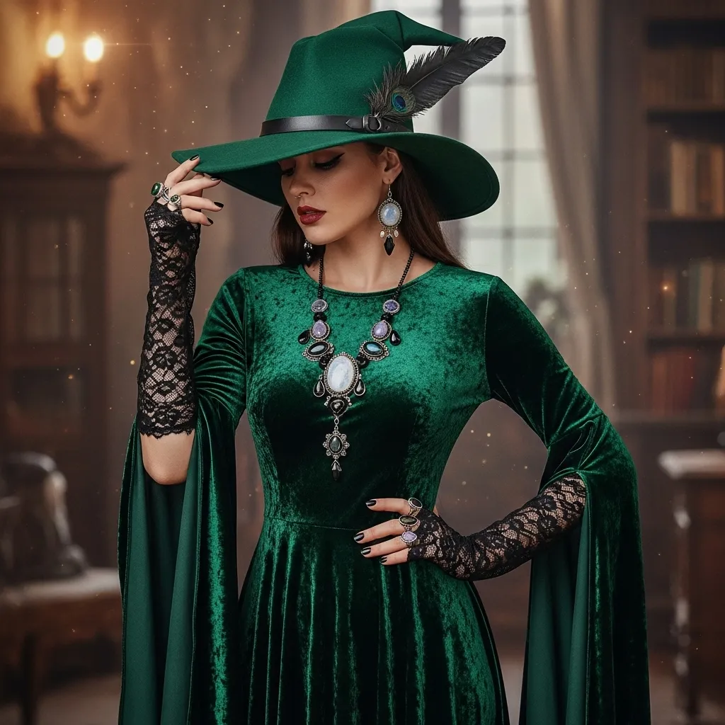 The base outfit often includes a velvet dress—fitted or flowing depending on preference. Dark colors like black, emerald, or plum give a magical aura. The classic wide-brim hat is essential, but modern versions feature lace, feathers, or sequins for extra flair.Accessories transform the costume. Gemstone jewelry (amethyst, onyx, or moonstone), lace gloves, and ornate belts elevate the look. Props like crystal balls, broomsticks, or spell books add narrative and fun.