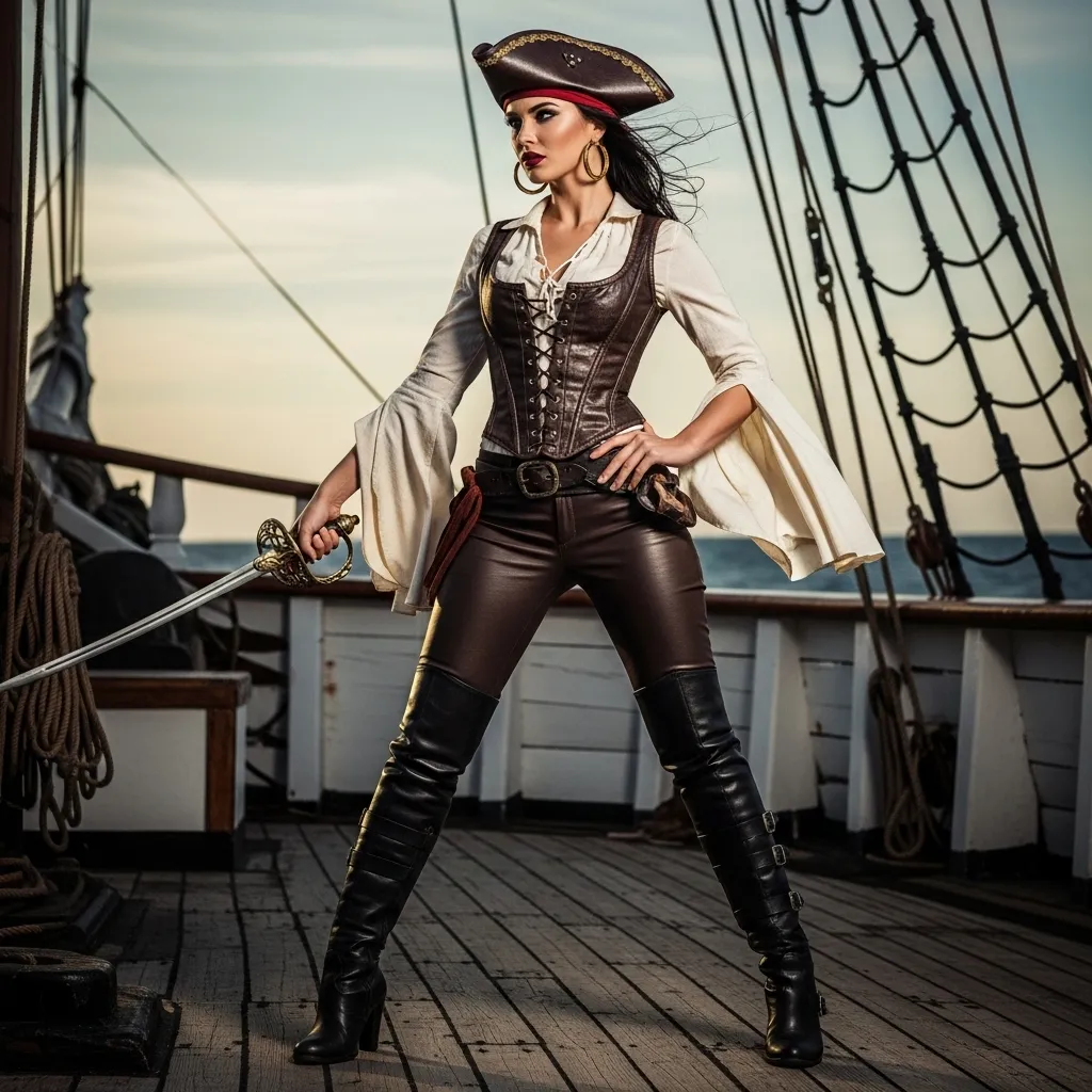 Start with a pirate-style blouse—billowy sleeves or lace details work well—paired with leather pants or a flowy skirt. A corset is the centerpiece, cinching the waist and giving a bold, structured silhouette. Tall boots and a tricorn hat complete the adventurous aesthetic.Accessories define the pirate queen look. Gold hoop earrings, layered chains, and belts with buckles add flair. Props like a toy sword or a map can serve as playful additions. A striped scarf tied around the waist or head brings authentic pirate vibes.