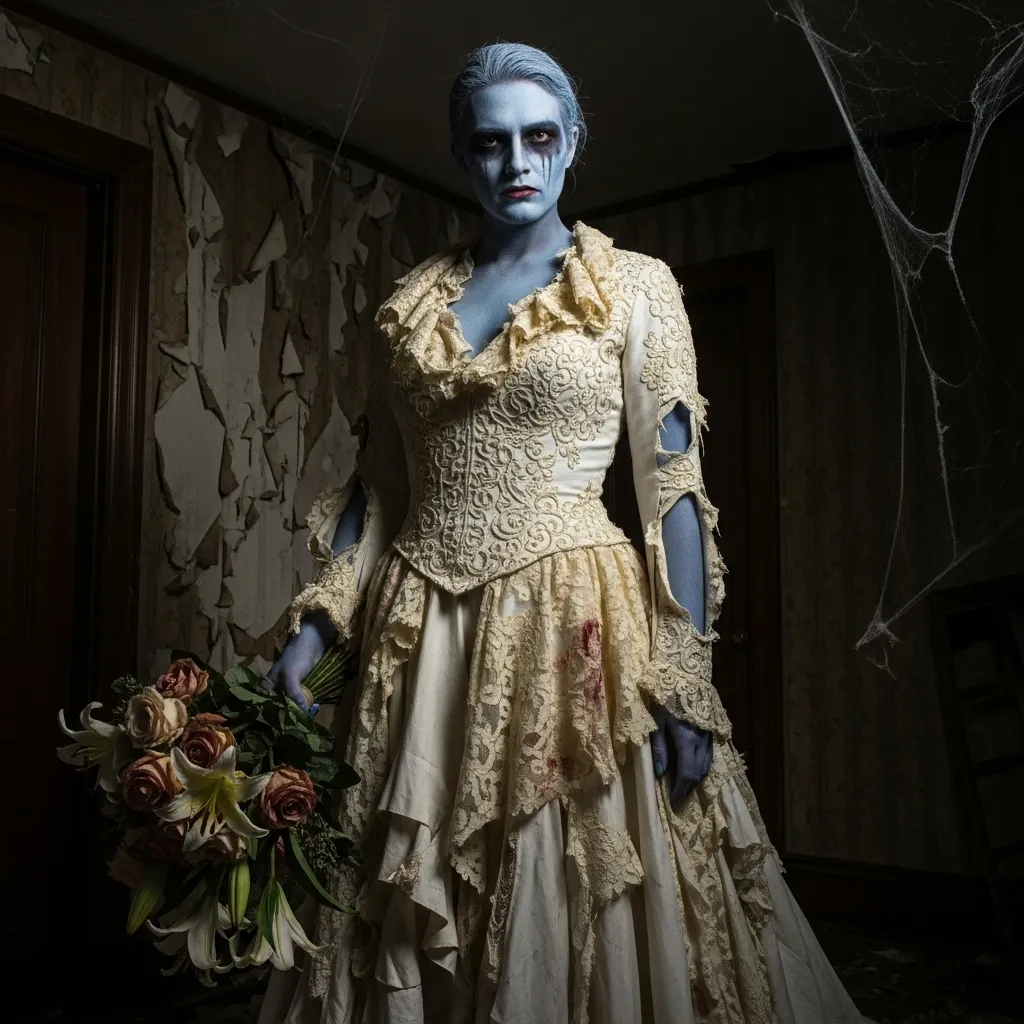 The dress is essential Choose a white or pale blue gown—either thrifted or styled with DIY tears and lace. Adding tulle, lace, or fabric distressing gives the gown a ghostly, worn appearance. A lace or mesh veil completes the bridal silhouette.Makeup creates the haunting allure. Pale blue or white face paint, darkened eyes, and shadowed cheekbones mimic the corpse bride aesthetic. Some add stitched details or skeletal designs for a more dramatic effect. Glitter or rhinestones can glamorize the ghostly finish.