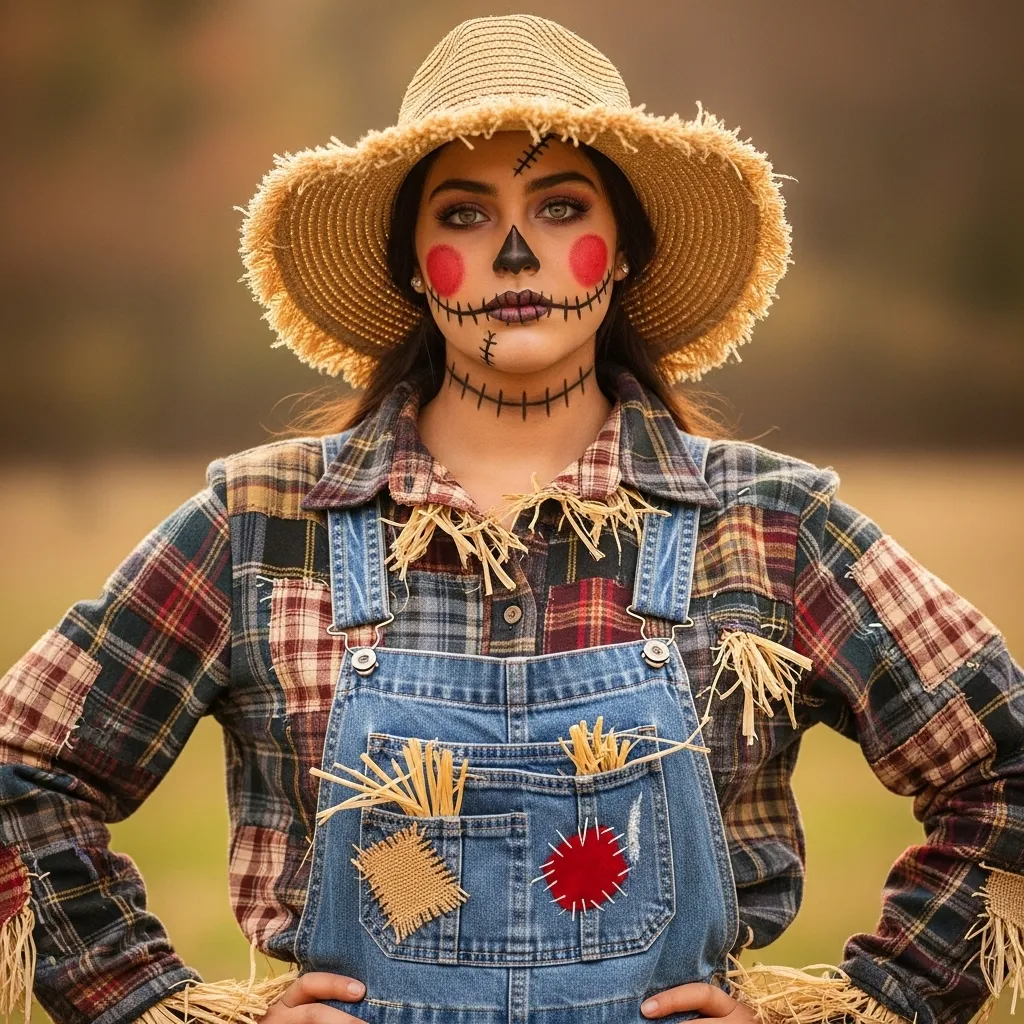 The outfit typically includes a plaid shirt, distressed jeans or overalls, and straw accents peeking from sleeves and pant cuffs. A floppy hat, either straw or fabric, completes the farm-inspired look. Adding colorful patches to clothing enhances authenticity and charm.Makeup is playful and easy. Use eyeliner or face paint to draw stitched smile lines across cheeks and a triangle nose. Bright blush or face paint adds a whimsical feel. Glitter or rhinestones can be added for a glamorous scarecrow twist.