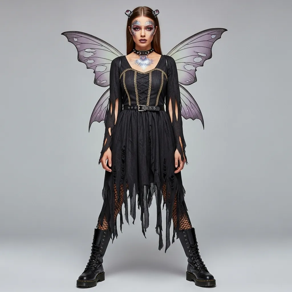 The wings make the look magical. Opt for distressed or DIY versions with rips, paint splatters, or glitter dusting. They should look ethereal but slightly ruined, reflecting the “fallen” element.Makeup plays a vital role. Glittery eyes, bold eyeliner, and metallic highlighter emphasize the fairy charm, while dark lipstick and shadow details add edginess. Rhinestones, body glitter, or temporary tattoos enhance the mystical look.