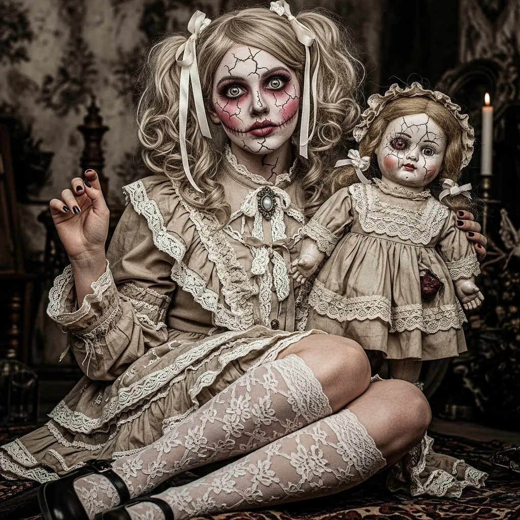 The magic lies in the makeup. A pale foundation base with cracked-doll face paint makes the look chilling. Wide, exaggerated eyeliner, false lashes, and rosy cheeks emphasize doll-like features. Add cracks using black eyeliner or face paint for a broken porcelain effect.Hair should enhance the doll illusion. Curly pigtails, braids, or ringlets are perfect. Adding bows or ribbons emphasizes the eerie innocence. Some choose to wear a doll mask or carry a porcelain doll prop for added effect.