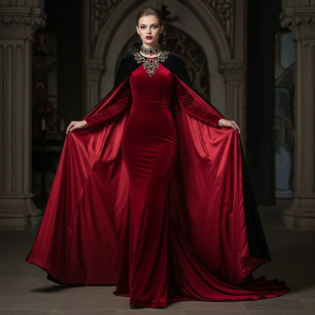 The base is a velvet or satin gown, ideally floor-length with gothic details like high collars, lace, or corsets. A flowing cape, preferably lined in red, enhances the drama. Pair with pointed heels or boots to complete the regal silhouette.Makeup is bold and commanding. Pale foundation, sharp contouring, and deep red lips create the iconic vampire look. Add smoky eyes with a touch of shimmer for glamour, and fake fangs for authenticity. A drop of fake blood at the lip corner makes the look more chilling.