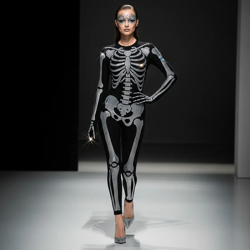 Makeup is essential for this outfit. Instead of traditional skull face paint, go for a glam skeleton look: use metallic eyeshadows, glitter eyeliner, and highlight for a radiant yet spooky vibe. Add rhinestones around the eyes or temples for an extra glamorous finish.For hair, sleek ponytails or space buns work great, especially when paired with hair glitter or metallic sprays. You can even wear a crystal crown for a skeleton-queen look.