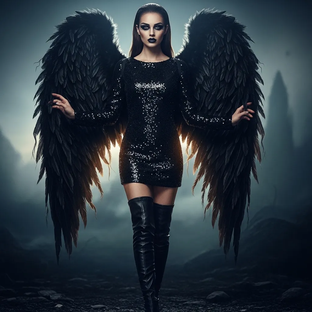Start with a black or metallic dress. A sequined mini dress adds sparkle, while a flowing gown creates drama and presence. Feathered wings—black or iridescent—are the signature element that makes the outfit instantly recognizable. Pair with tall boots or stilettos to enhance the commanding vibe.Accessories elevate the theme. A dark halo headband or spiked crown adds celestial contrast. Jewelry like silver cuffs, chokers, or moon-and-star pendants complete the celestial-meets-goth aesthetic. A small clutch with glitter or rhinestones ties the glamorous look together.