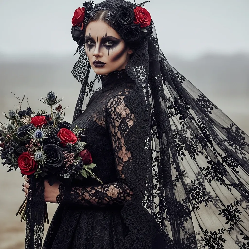 The gown is the centerpiece. Choose a black lace or satin bridal dress, either a flowing ballgown or a sleek corset design. Long sleeves add vintage elegance, while sheer lace details bring in gothic sensuality. A dramatic black veil—embroidered or plain—completes the bridal silhouette.Accessories add narrative depth. Carry a bouquet of dark red roses or black artificial flowers for a dramatic prop. A jeweled crown or lace choker emphasizes the gothic aesthetic. Gloves, pearl strands, or layered necklaces can enhance the vintage bridal feel.