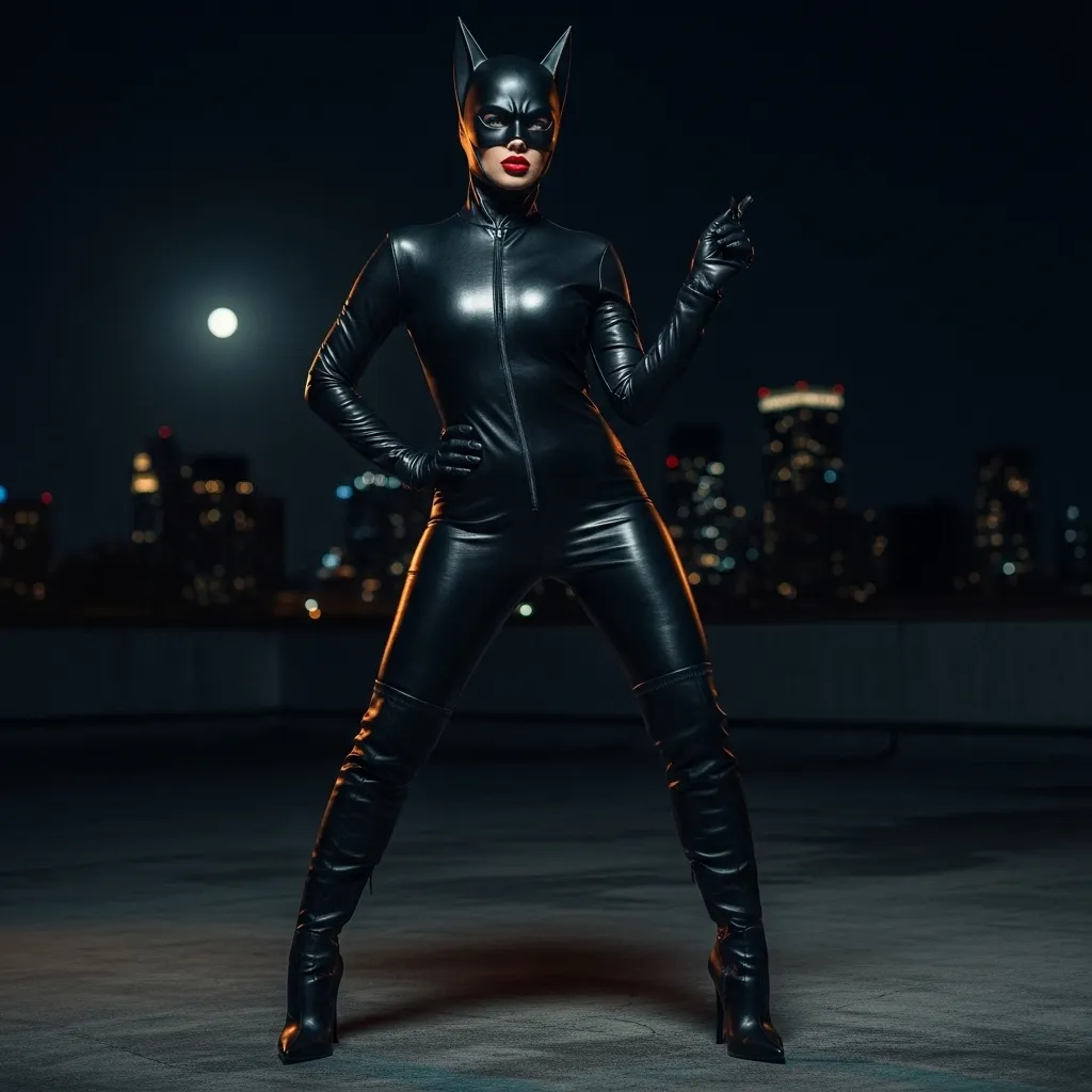 Footwear should be fierce—pointed stiletto boots or thigh-highs work perfectly. A utility-style belt or whip can act as costume props while reinforcing the Catwoman theme.Makeup should balance elegance with drama. Red lipstick contrasts beautifully with the black outfit, while winged eyeliner or smokey eyes give feline energy. Hairstyles can be slicked back, braided, or styled in loose waves to match the bold look.