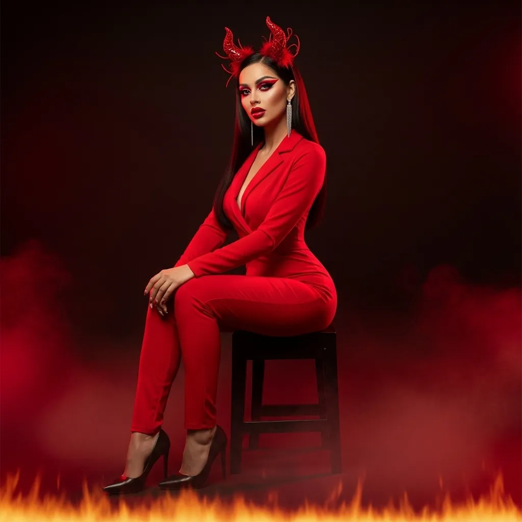 Makeup makes this look unforgettable. Bold red lipstick, smokey red-black eyeshadow, and winged eyeliner amplify the devilish charm. You can add face gems or glitter to glam up the traditional devil appearance.Jewelry like chunky gold hoops, layered chains, or fiery red chokers add attitude. Hairstyles like slick ponytails, Hollywood waves, or even flame-inspired hair dye enhance the aesthetic.