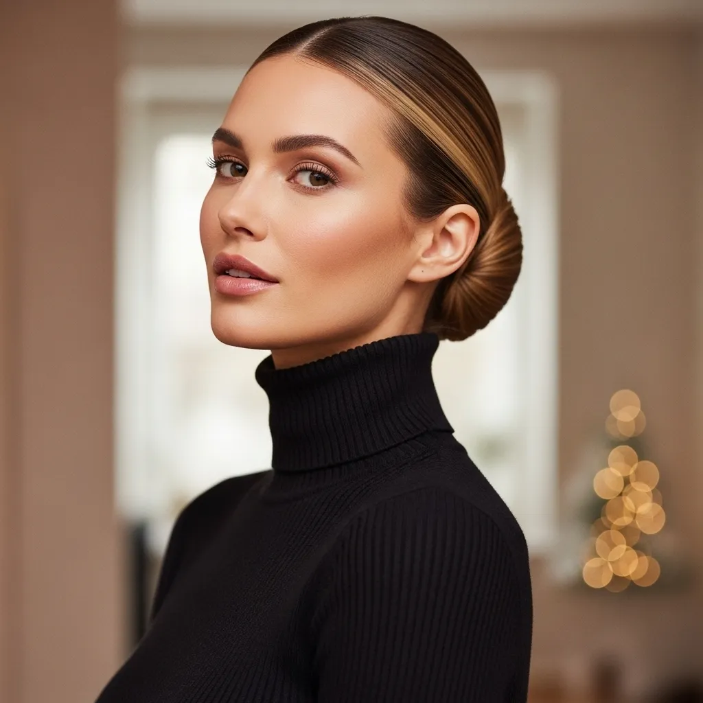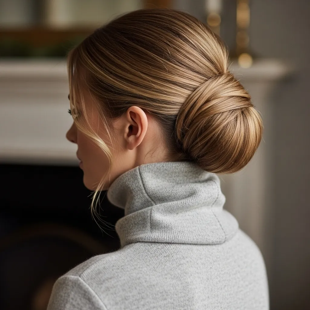 The classic chignon is one of the most elegant hairstyles for high neck outfits. Its neat, polished look highlights the neckline, creating a sophisticated vibe. Perfect for professional settings, dinners, or formal occasions, this hairstyle adds timeless charm. The chignon is practical, long-lasting, and effortlessly chic. Paired with a high neck piece, it creates a polished cozy chic appearance that works across all winter occasions, from office wear to evening gatherings.