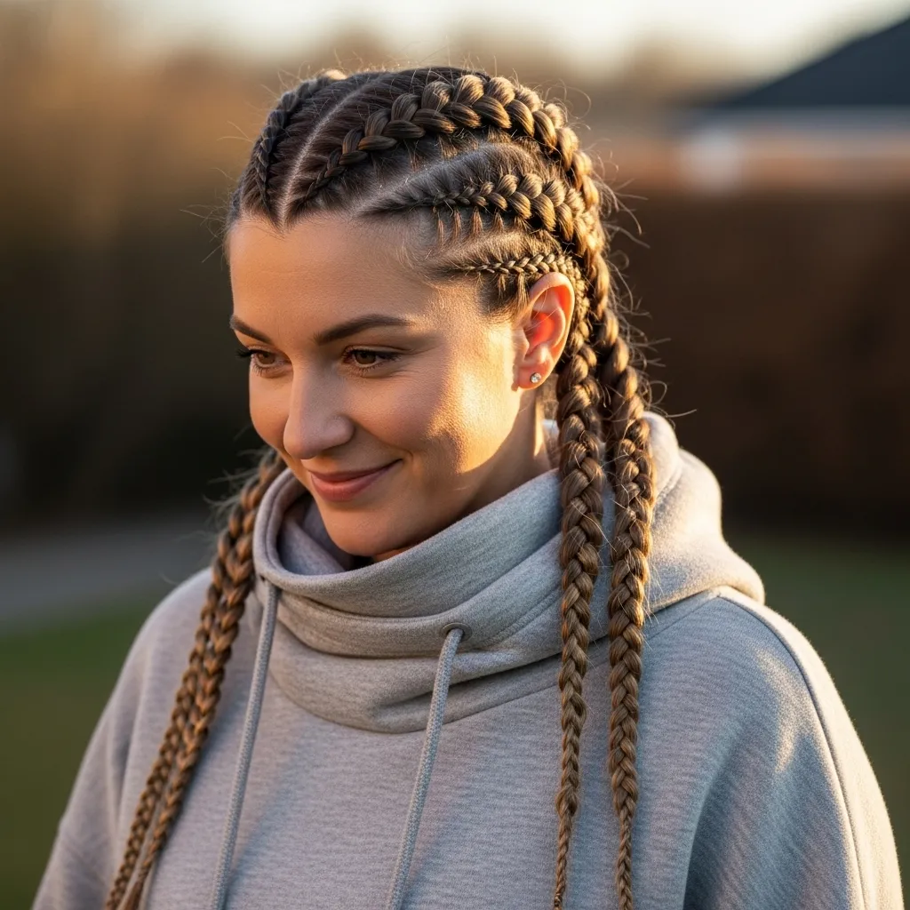 Double Dutch braids are the perfect mix of playful and practical, especially when paired with cozy high neck hoodies. By weaving hair tightly along the scalp, the braids stay secure throughout the day, making them ideal for active lifestyles, workouts, or casual outings in winter. They add structure to your look while keeping the hoodie’s neckline visible, ensuring a balanced cozy chic aesthetic.