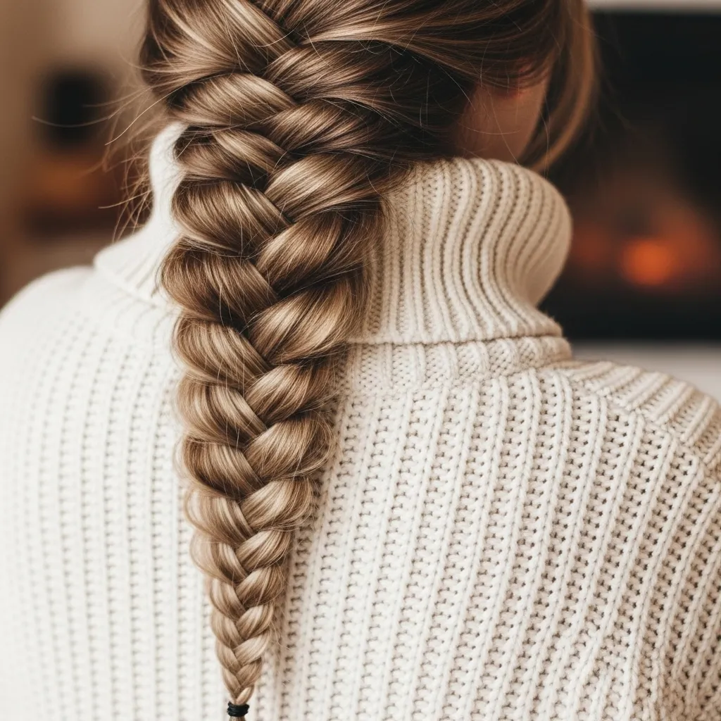 The fishtail braid adds intricate detail to chunky knit turtlenecks. Its textured design contrasts with thick fabrics, creating a stylish balance. Draped over one shoulder, the braid showcases both hair and neckline. Perfect for casual outings or cozy evenings, this hairstyle is versatile and practical. The fishtail braid’s unique pattern elevates winter looks, ensuring a chic fashion statement. Combined with knitwear, it creates a cozy chic aesthetic that’s fashionable and functional.