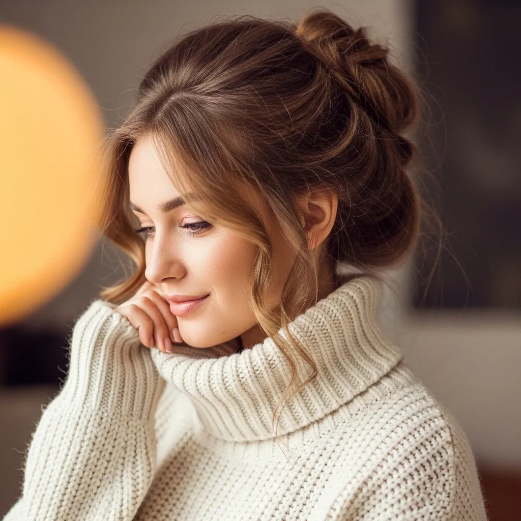 The messy top knot is a casual yet chic hairstyle that pairs perfectly with oversized sweaters. Its undone, playful vibe balances the bulkiness of high-neck outfits, creating effortless charm. This hairstyle is practical, quick to style, and ideal for cozy winter days. Whether lounging at home, grabbing coffee, or running errands, the messy top knot ensures comfort and chicness. Combined with chunky knitwear, it’s the ultimate cozy chic fashion statement.