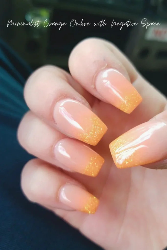 Minimalism in nail art is trending, and orange ombre with negative space designs is the perfect example. By leaving parts of the nail bare and blending orange gradients into clear sections, the design looks modern and artsy.