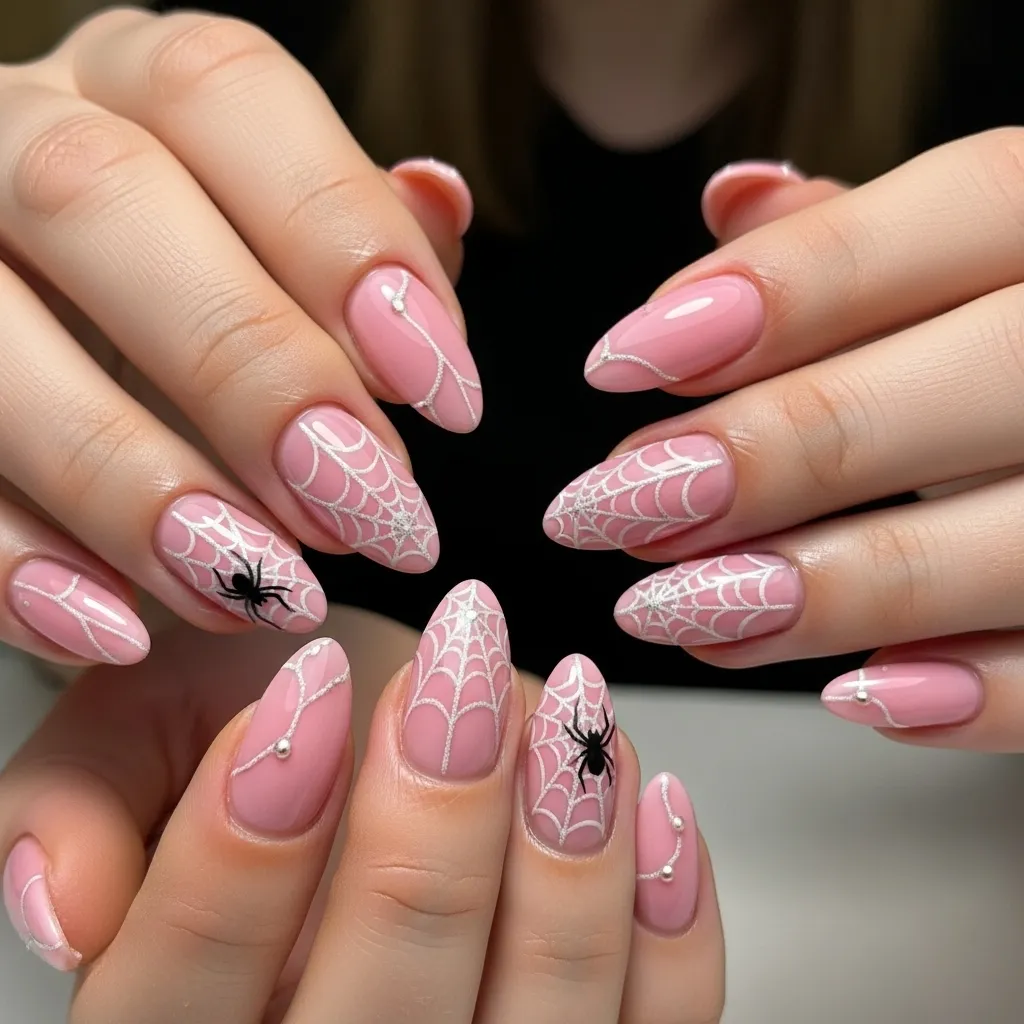 Spider web designs are a Halloween classic, but painting them on a pink base gives the look a refreshing twist. Light pink polish with delicate black webs adds spooky detail while still keeping a feminine vibe. This design is perfect for both long and short nails, allowing you to showcase intricate artistry without overwhelming the nail.