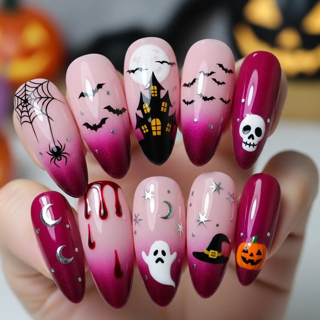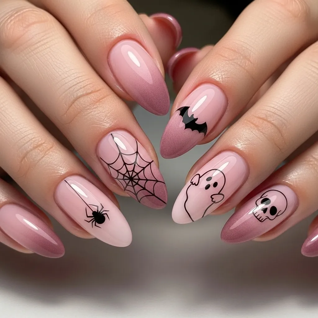 Ombre nails are always chic, and when you combine pink with Halloween themes, the result is both stylish and festive. A gradient from pale pink to hot pink creates a base that’s perfect for adding spooky details like bats, spiders, or ghosts.