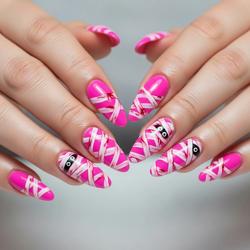 Mummy nail art gets a sweet upgrade when paired with candy-pink tones. Using a bubblegum pink base, add white or light gray striping to mimic mummy bandages. Small eye designs peeking through the bandages give the nails a cute, spooky finish.