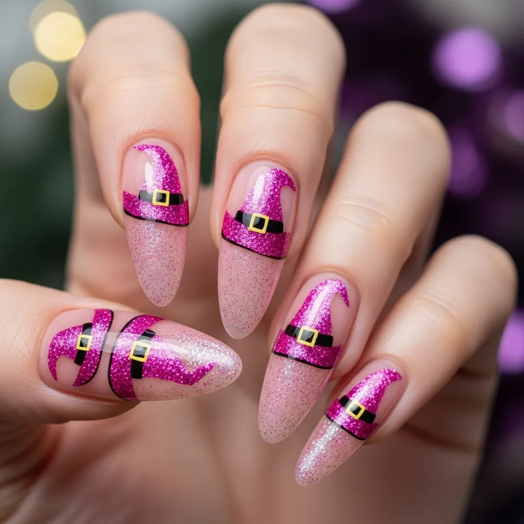 12. Sparkly Pink Witch Hat Nails