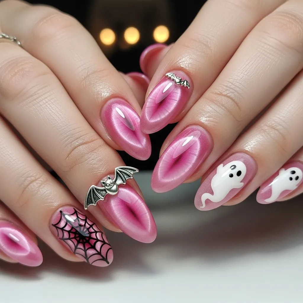 13. Pink Cat Eye Nails with Spooky Accents