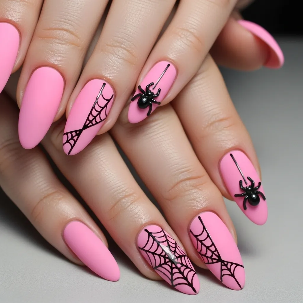 15. Pink Matte Nails with Spider Accents