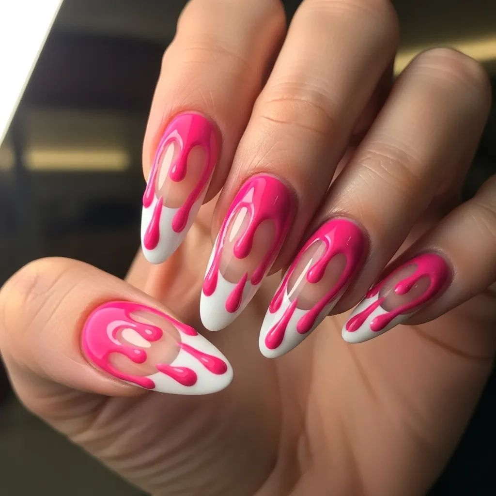 For a more dramatic effect, use neon pink polish for the drips and add tiny black accents like bats or stars. Pink drip French tips are a chic, creative spin on a classic style, perfect for October.