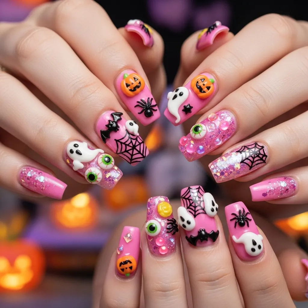 3D nail art takes spooky glam to the next level. With pink as the base, you can add 3D accents like tiny pumpkins, rhinestone bats, or raised spider webs for a standout look.