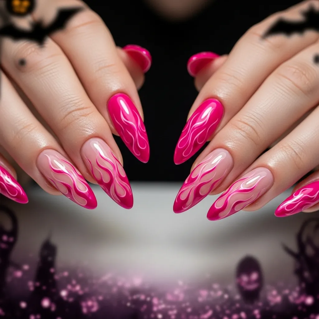 Flame nails are edgy, and in hot pink, they bring bold energy to Halloween looks. A black or nude base with bright pink flames makes the design fiery, dramatic, and festive.