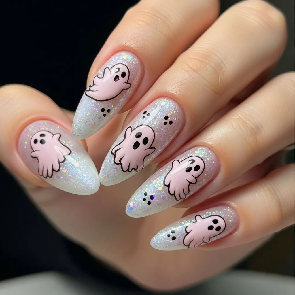 3. Glittery Pink Ghost Nails