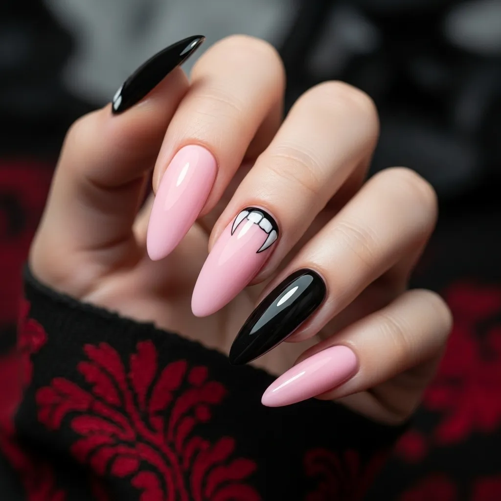 For those who want a darker edge, pink and black vampire-inspired nails strike the perfect balance. Think deep fuchsia with sharp black tips or coffin-shaped nails painted in alternating pink and jet-black shades. Add tiny vampire fangs or blood-drip art for a chilling effect.
