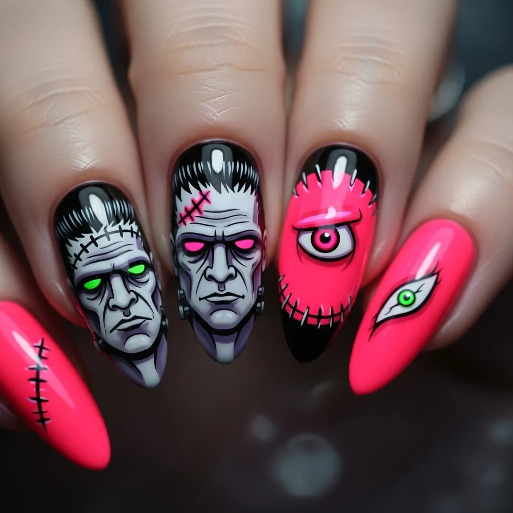 5. Neon Pink Frankenstein Nails