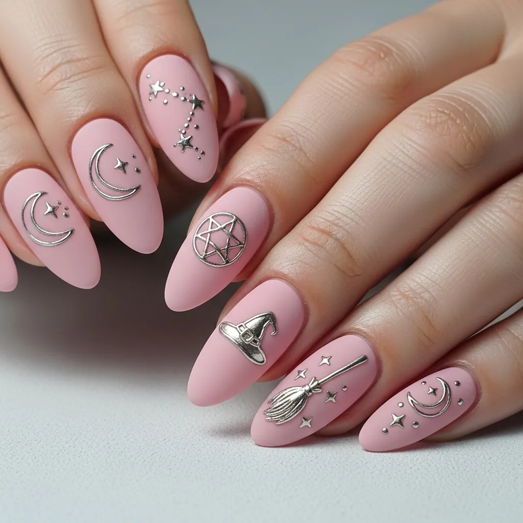 Witch-themed nails are always a Halloween hit, and soft pink versions give them a chic, enchanting touch. Think pastel pink bases with crescent moons, stars, or tiny broomstick designs. Adding metallic gold or silver accents enhances the mystical vibe without losing the feminine softness.