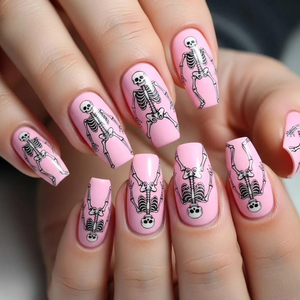 Skeleton nails are a Halloween staple, but painting them in pink adds an unexpected twist. A pastel or neon pink base with skeletal outlines in white or black creates a bold yet playful look. The design can range from delicate finger bones to full skeleton hand details, depending on your nail length and style.