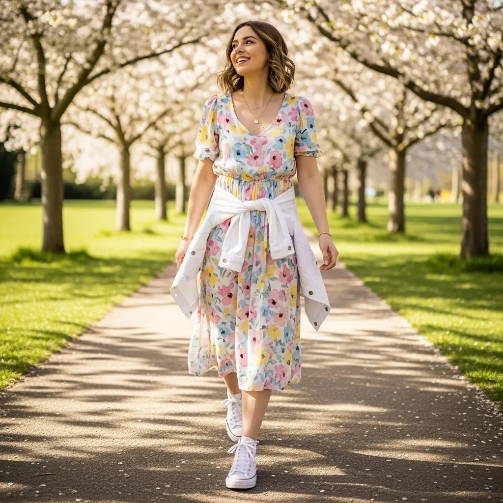The floral midi dress paired with sneakers is a quintessential spring outfit that combines comfort, elegance, and everyday practicality. Midi dresses are flattering for most body types due to their flowy silhouette, and the floral pattern brings in the seasonal spirit, reflecting brightness, freshness, and nature’s beauty. Pairing the dress with casual white sneakers gives the look a relaxed yet trendy vibe, making it perfect for spring outings like picnics, weekend strolls, or casual brunches with friends.The versatility of this outfit is one of its strongest points. Accessories such as a small crossbody bag, layered necklaces, or a wide-brim hat can add personality and style. For slightly cooler days, pairing the dress with a light denim or cropped jacket maintains comfort while keeping the outfit chic. The choice of footwear can also be adapted; while sneakers offer practicality and casual flair, sandals or ankle boots can elevate the look for more formal settings.