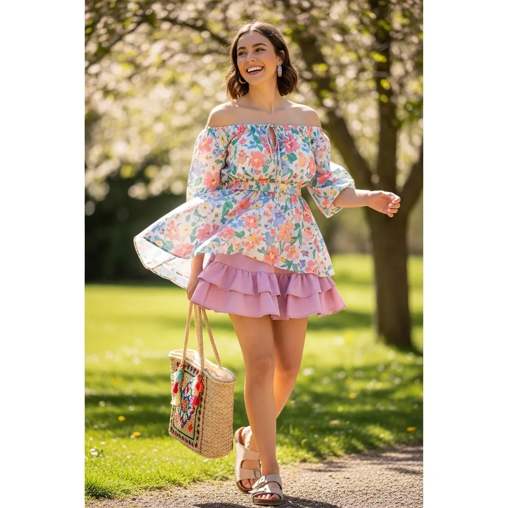 This outfit combines comfort, style, and playfulness, making it ideal for students, young professionals, or anyone wanting a cheerful and trendy spring ensemble. Its balance of casual denim and elegant off-shoulder styling ensures the wearer looks put-together without effort.Ultimately, the off-shoulder top with denim skirt is a versatile and seasonally appropriate choice. It showcases how combining playful and classic pieces can produce a fresh, stylish, and functional spring outfit suitable for multiple settings and activities.
