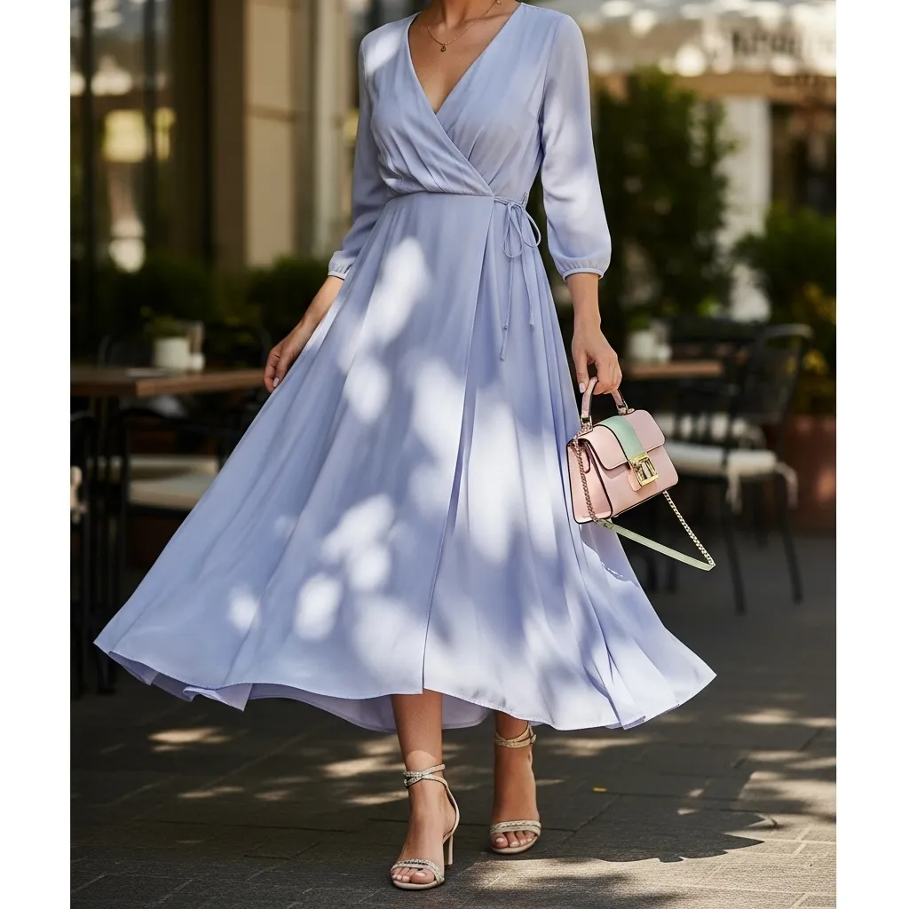 This outfit is ideal for multiple occasions, including school, casual work settings, brunch, or outdoor social activities. Footwear choices can adapt the outfit’s formality, with strappy sandals offering a relaxed vibe and wedges or low heels elevating it for more formal or semi-dressy events. Accessories such as a small handbag, delicate jewelry, or a sunhat can enhance the ensemble’s charm and tie the look together seamlessly.The wrap dress is versatile in color and pattern. Pastel tones evoke freshness, while floral or subtle prints bring spring energy and playfulness. Layering with a lightweight cardigan, denim jacket, or cropped blazer provides additional styling options and warmth for cooler mornings or evenings.