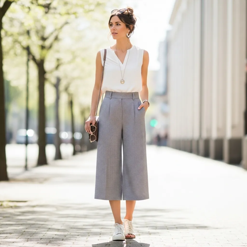 The sleeveless blouse and culottes combination demonstrates how lightweight and structured pieces can create a polished and contemporary spring look. Its ease of wear, trend-forward silhouette, and adaptability make it perfect for students, young professionals, or anyone seeking style without sacrificing comfort.Ultimately, this ensemble highlights how thoughtful pairings can produce a chic, breathable, and stylish spring outfit suitable for multiple occasions, embodying confidence, trendiness, and seasonal appeal.
