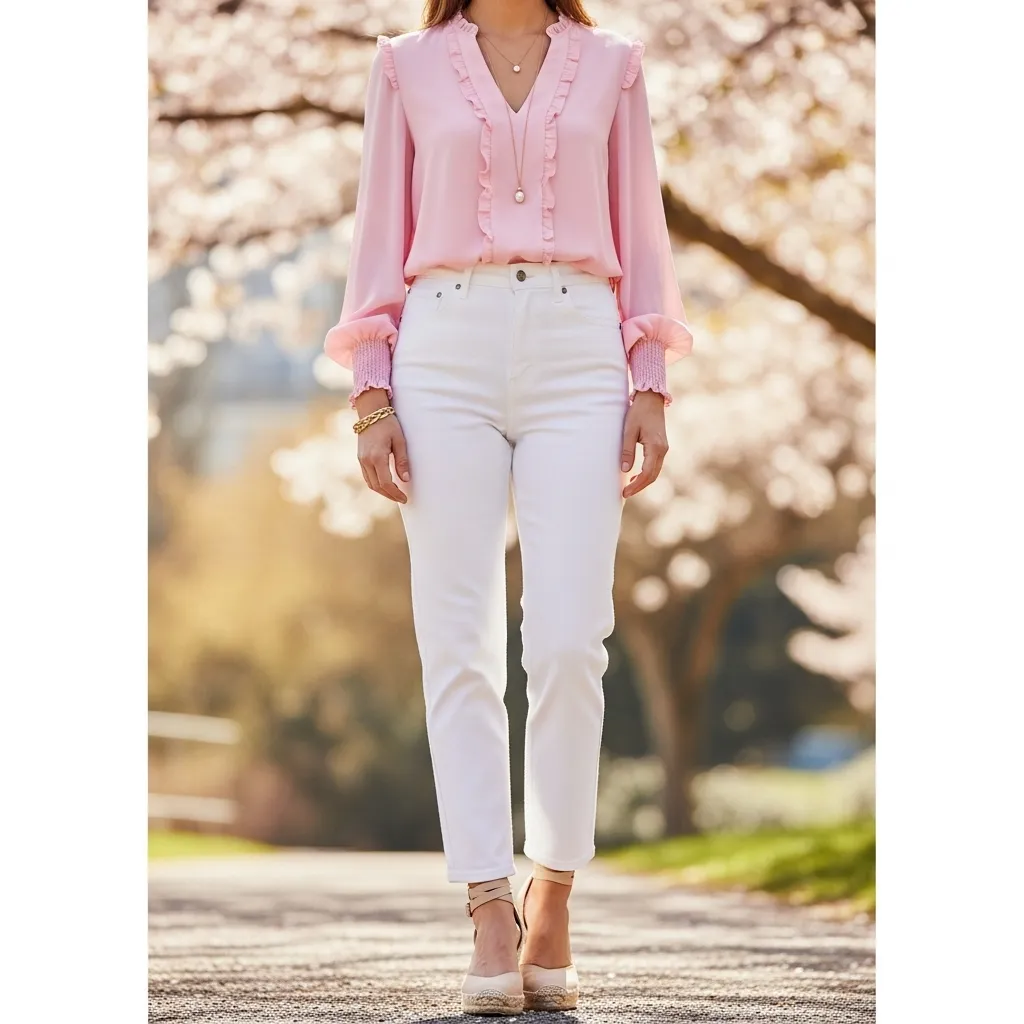 Layering options are plentiful. Light cardigans, cropped jackets, or blazers can be added for cooler spring days, while keeping the outfit breathable and comfortable. This combination demonstrates how minimalistic choices can achieve a sophisticated, stylish, and versatile look, ideal for students, young professionals, or anyone embracing the spring season.The pastel blouse with white jeans outfit proves that simplicity, combined with thoughtful color coordination and accessories, can create a fashion-forward yet effortless ensemble perfect for spring. It’s elegant, adaptable, and timeless.