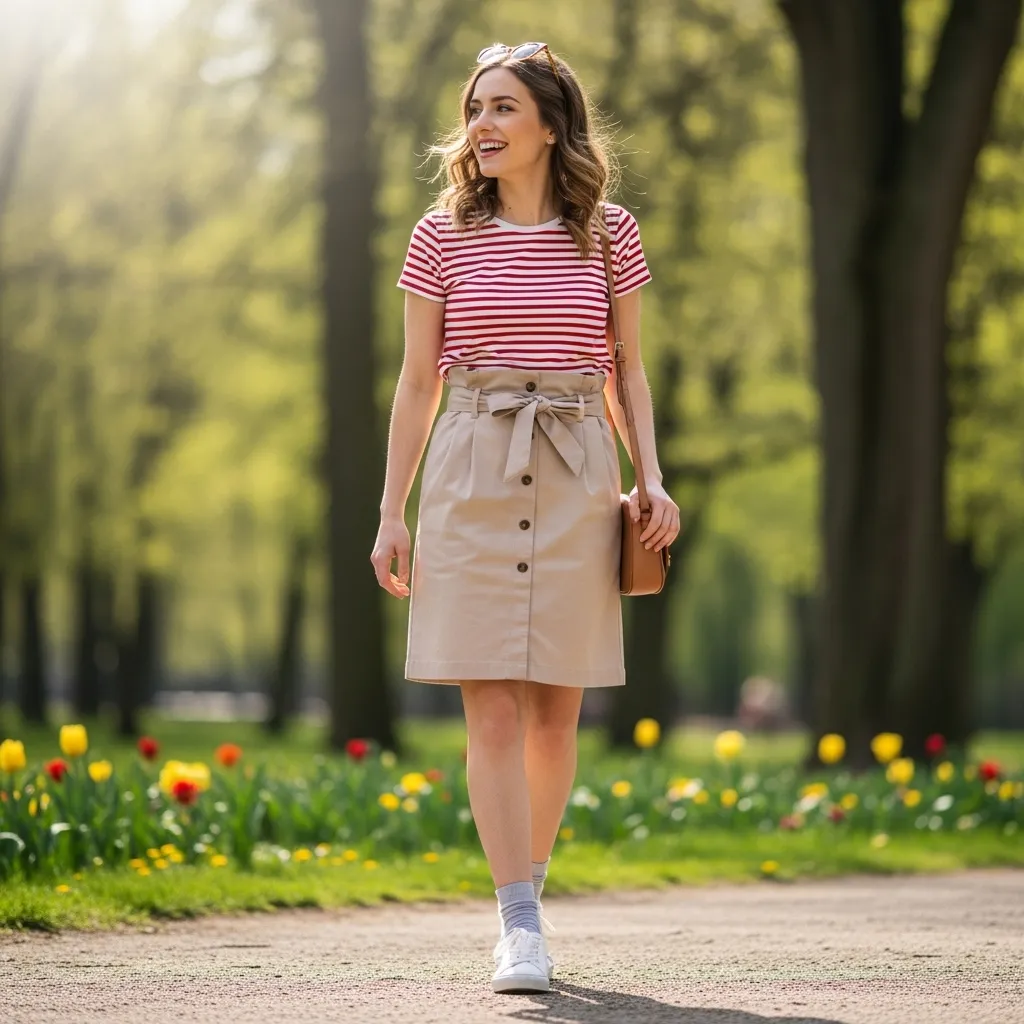 This outfit highlights the balance between playful casual pieces and structured, chic elements. Its comfort, ease of styling, and trendiness make it suitable for a variety of occasions while ensuring the wearer feels confident and fashionable.Ultimately, the striped tee with paperbag skirt outfit is a spring wardrobe essential. It embodies effortless style, versatility, and seasonal charm, making it perfect for students, young professionals, or anyone seeking a fun yet chic look for spring.