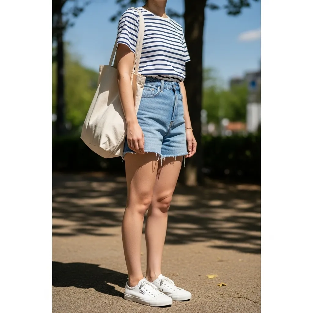 The outfit is versatile across colors and patterns. Tees can feature bold stripes, subtle pinstripes, or pastel tones to match your mood or wardrobe palette. Shorts can range from denim, linen, or cotton blends, offering comfort, breathability, and easy styling options. Adding layers such as a lightweight cardigan or open-front jacket can prepare the outfit for cooler mornings or evenings.This look emphasizes practicality without compromising style. Its casual, playful vibe makes it suitable for students, young professionals, or anyone seeking a youthful and energetic spring outfit. The combination of classic stripes and high-waisted shorts ensures timeless appeal while offering modern versatility.