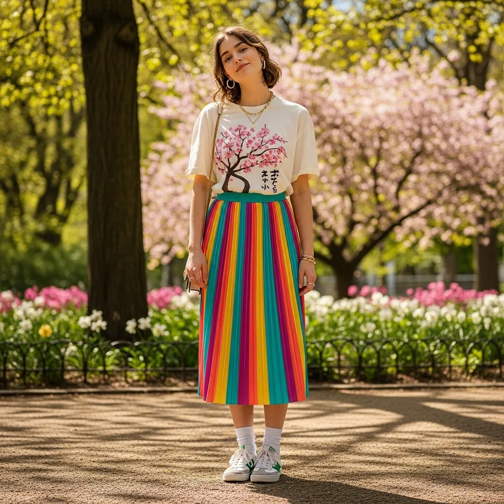 Footwear plays a crucial role in styling this outfit. Sneakers are perfect for a casual, practical vibe, while ballet flats or low heels can elevate the look for more polished occasions. Accessories such as small hoop earrings, layered necklaces, or a colorful crossbody bag can enhance the outfit and tie colors together seamlessly.The pleated skirt and graphic tee combination is highly adaptable. Tucking in the tee slightly creates a defined waistline, while leaving it loose maintains a relaxed silhouette. Adding a light cardigan, denim jacket, or even a cropped blazer introduces versatility for temperature changes and style variations.