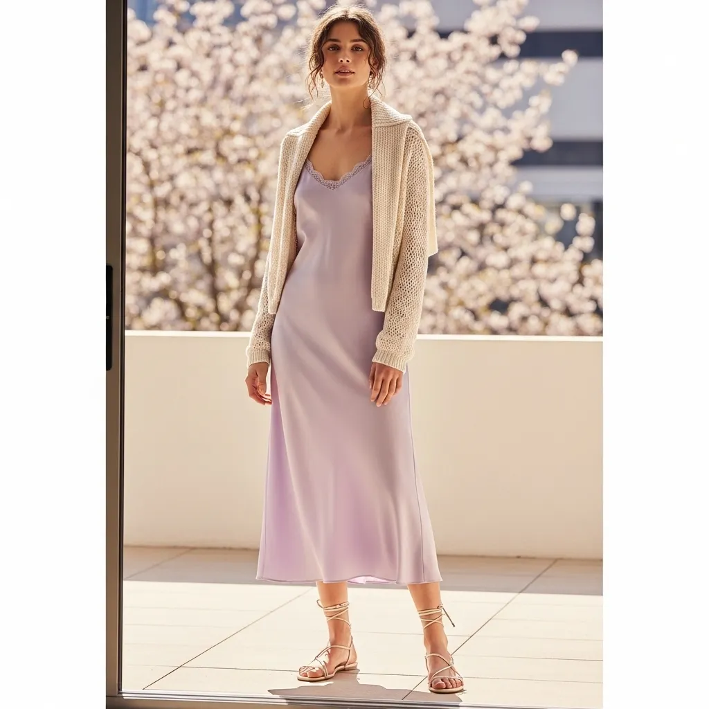 A slip dress layered with a lightweight cardigan is an effortlessly chic spring outfit that balances style, comfort, and versatility. Slip dresses, often made from silky or breathable materials, offer a sleek silhouette while maintaining ease of movement, perfect for warmer spring days. Layering with a lightweight cardigan introduces warmth, practicality, and the ability to adjust the look for slightly cooler mornings or breezy afternoons.Footwear choices can adapt the outfit to different occasions. Sandals, flats, or casual sneakers keep the outfit comfortable and approachable, while low heels or strappy sandals elevate it for a more polished look. Accessories like delicate necklaces, subtle earrings, or a minimalist tote bag enhance the outfit’s charm without overpowering its simplicity.