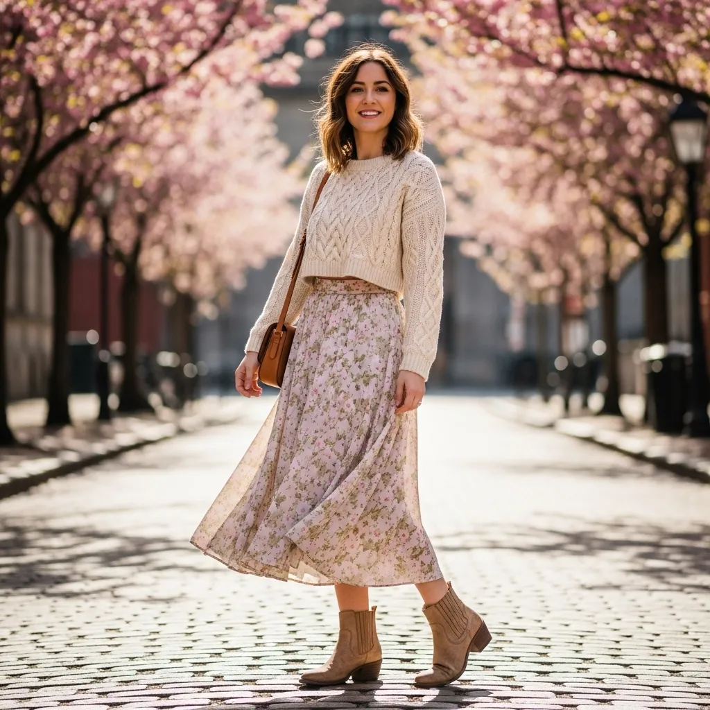 The combination balances casual comfort with feminine charm, demonstrating how thoughtful layering and proportions create a polished spring look. Cropped sweaters highlight the waist, while midi skirts elongate the legs, producing a flattering silhouette.Overall, the cropped sweater with midi skirt outfit is a versatile, stylish, and practical choice for spring. Its blend of casual charm, elegance, and adaptability makes it an essential go-to for students, young professionals, or anyone seeking a chic yet comfortable seasonal ensemble.
