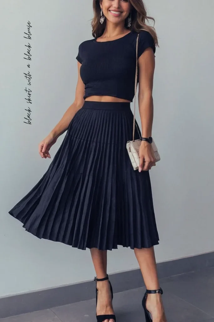 Pairing a black skirt with a black blouse is a timeless look that works for work and semi-formal events. A pencil skirt with a fitted blouse exudes professionalism, while a pleated or A-line skirt with a loose blouse adds a feminine touch. Accessorize with minimal jewelry or a bold belt to break the monotony.