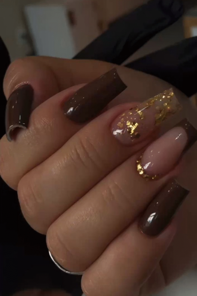 Brown and gold = instant glam. A subtle metallic detail takes brown nails from everyday chic to evening-ready.