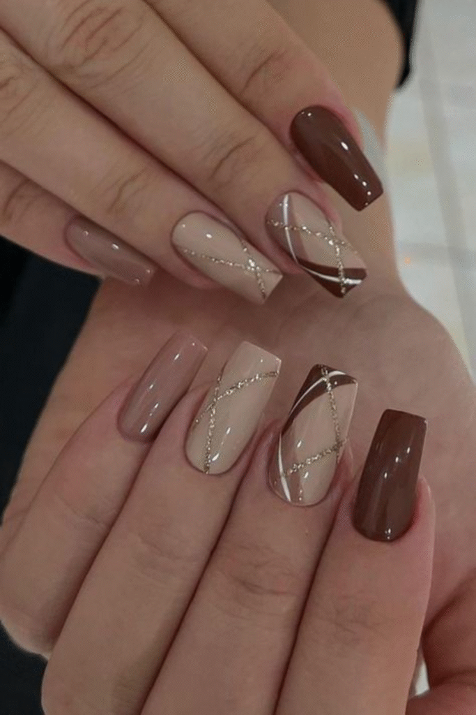 This design balances boldness and subtlety by mixing nude and brown shades.