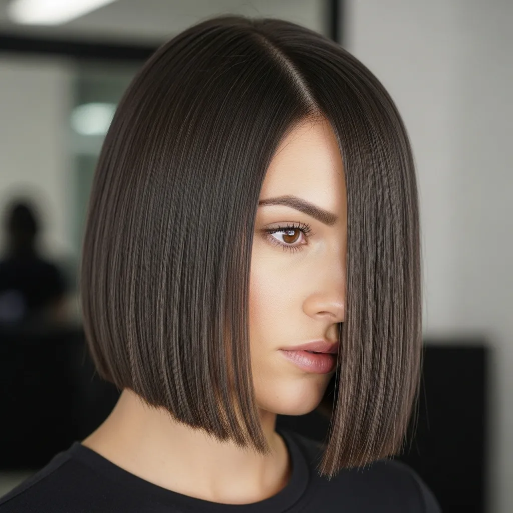 The sleek blunt bob is a modern classic that radiates confidence and sophistication. Its sharp, straight edges give a polished and edgy vibe, perfect for office looks, casual outings, or social events. This hairstyle works best with straight or slightly wavy hair and can be styled effortlessly with a flat iron. Pair with bold makeup or minimalist accessories for a striking, Instagram-worthy look that highlights your facial features and elevates your style.The sleek blunt bob is a trendsetting hairstyle that perfectly blends sophistication, elegance, and modern appeal. Defined by its sharp, straight ends, this cut emphasizes precision and style, giving the hair a bold, structured appearance. Ideal for those seeking a low-maintenance yet high-impact hairstyle, the blunt bob works exceptionally well with straight or slightly wavy hair, allowing for smooth, polished finishes.