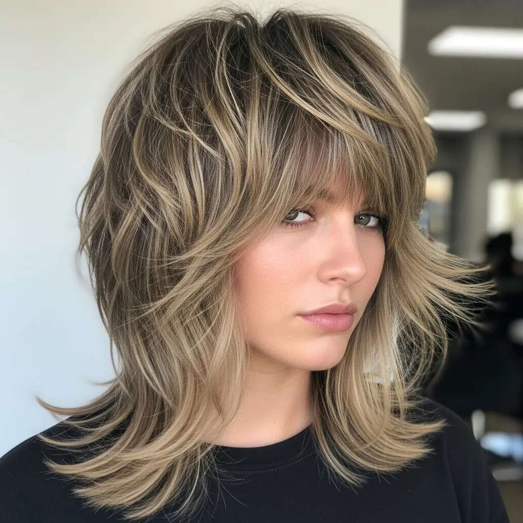 Creating a shag cut involves strategically layering the hair to add depth, fullness, and texture. Styling can include tousled waves for a relaxed, beachy vibe or straightening for a polished and edgy look. Products like texturizing sprays, mousses, or light hairsprays enhance volume and maintain the style throughout the day.The layered shag cut suits various face shapes and hair lengths, particularly medium-length hair. It softens angular features, adds balance to round faces, and highlights facial structures with effortless style. Subtle highlights, balayage, or ombre techniques further enhance dimension and visual appeal, making it Instagram-ready.