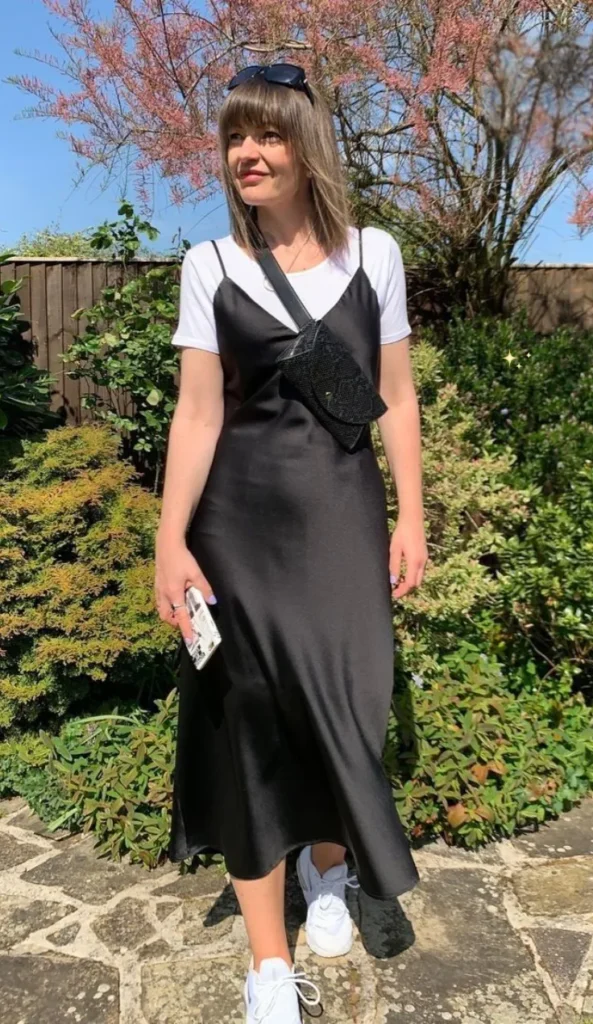 2. Satin Slip Dress + Layered Chains + Ankle Boots