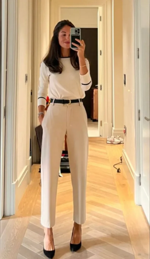 3. Monochrome Neutrals: Cream Top + Beige Trousers + Nude Heels